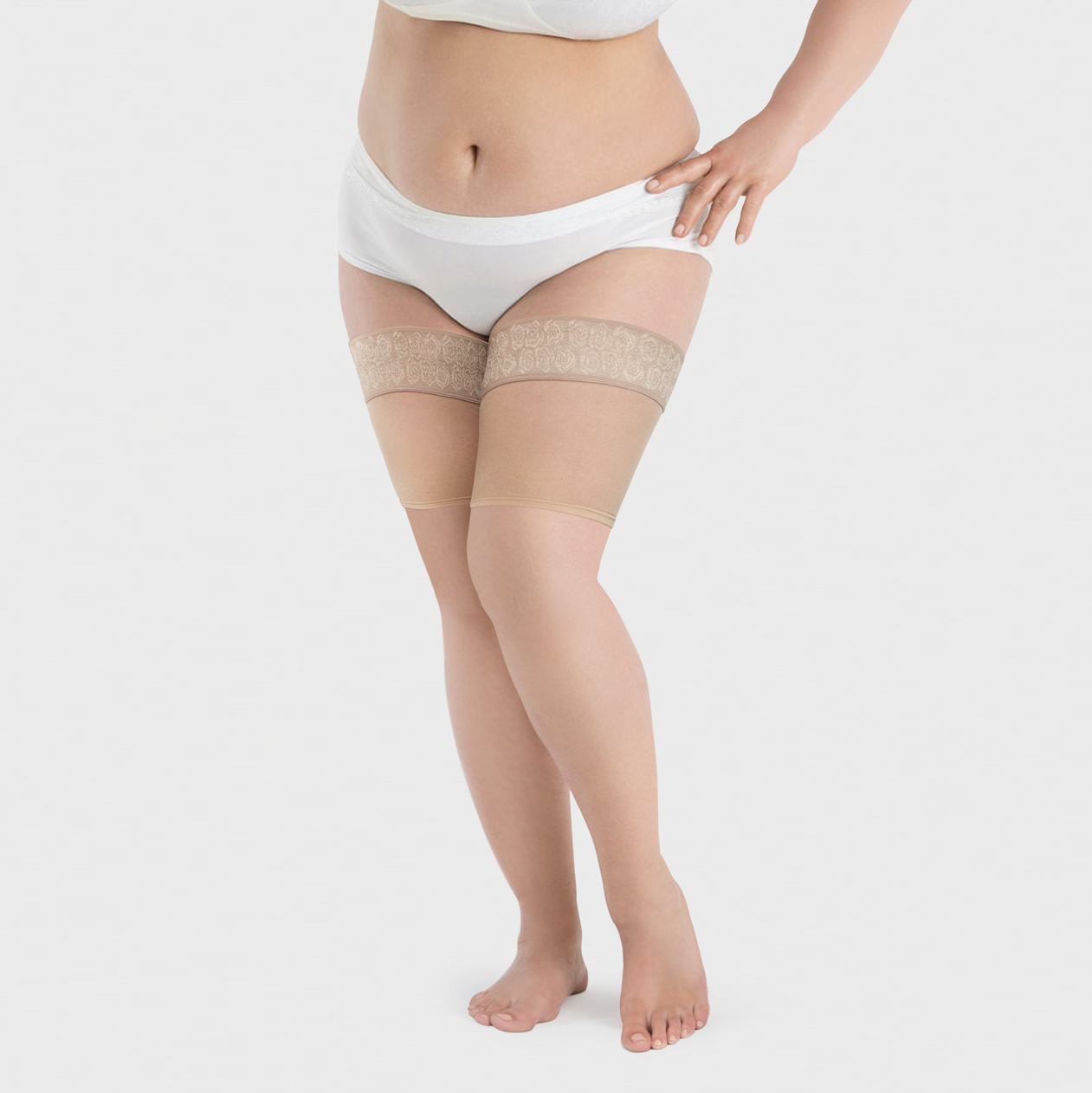 Имея полные бёдра некоторые женщины сталкиваются с проблемой натирания при ходьбе внутренней поверхности бедра. Для решения этой задачи отлично подходят бандалетки Hip-01 от компании Экотен. Они оснащаются широкой резинкой на силиконовой основе, которая надёжно удерживает бандалетки на ноге, предотвращает скручивание и сползание изделия в процессе носки.